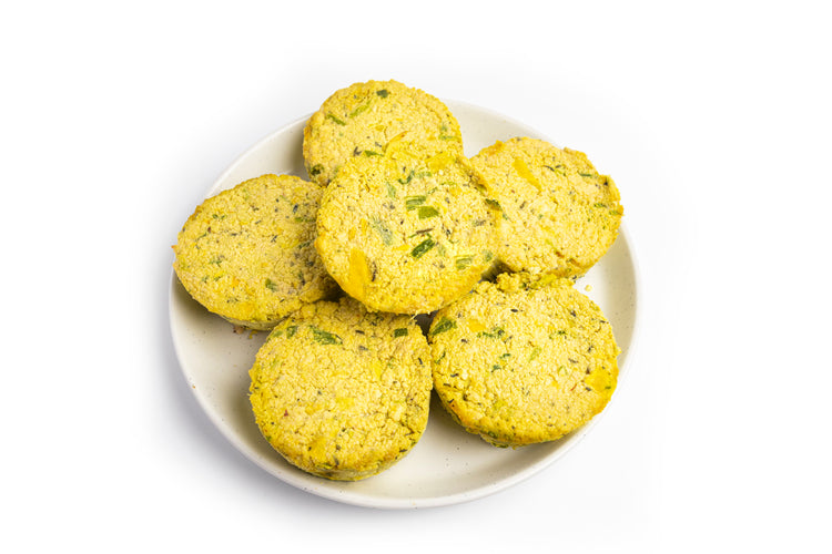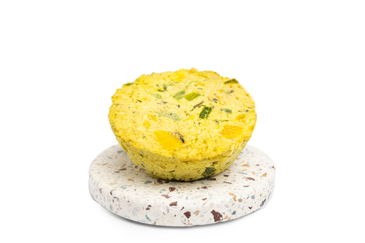 Ingredients: tofu, green onions, sweet peppers, dried herbs, spices, nutritional yeast, soy milk, vegan butter, potato starch, tapioca flour, psyllium husk fiber, baking soda, arrowroot starch